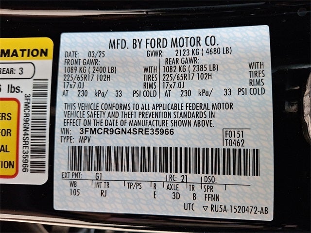 This Vehicle Includes the Following Options: Convenience Package (Front Driver/Passenger Seat Back Map Pockets, Heated 8-Way Power Driver's Seat, LED Fog Lamps, Premium Wrapped Steering Wheel, and Universal Garage Door Opener (UGDO)), Equipment Group 250A, 4-Wheel Disc Brakes, 6 Speakers, ABS brakes, Air Conditioning, Alloy wheels, AM/FM radio: SiriusXM, AM/FM Stereo, Auto High-beam Headlights, Automatic temperature control, Brake assist, Compass, Delay-off headlights, Driver door bin, Driver vanity mirror, Dual front impact airbags, Dual front side impact airbags, Electronic Stability Control, Emergency communication system: SYNC 4 911 Assist, Four wheel independent suspension, Front anti-roll bar, Front Bucket Seats, Front Center Armrest, Front License Plate Bracket, Front reading lights, Fully automatic headlights, Heated door mirrors, Illuminated entry, Knee airbag, Low tire pressure warning, Occupant sensing airbag, Outside temperature display, Overhead airbag, Overhead console, Panic alarm, Passenger door bin, Passenger vanity mirror, Plaid Cloth Front Bucket Seats, Power door mirrors, Power steering, Power windows, Radio data system, Rear anti-roll bar, Rear Parking Sensors, Rear reading lights, Rear seat center armrest, Rear window defroster, Rear window wiper, Remote keyless entry, Security system, SiriusXM, Speed control, Speed-sensing steering, Speed-Sensitive Wipers, Split folding rear seat, Steering wheel mounted audio controls, SYNC 4 w/Enhanced Voice Recognition, Tachometer, Telescoping steering wheel, Tilt steering wheel, Traction control, Trip computer, Variably intermittent wipers, and Wheels: 17 Oxford White-Painted Aluminum.