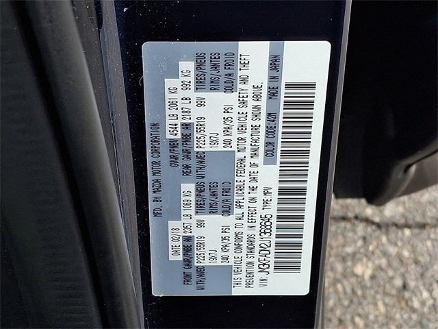 This Vehicle Includes the Following Options: Premium Package (Active Driving Display (Windshield Type), Heated Rear Seats, Heated Steering Wheel, and Windshield Wiper De-Icer), 10 Speakers, 19 x 7J Aluminum Alloy Wheels, 4-Wheel Disc Brakes, 4.325 Axle Ratio, ABS brakes, Air Conditioning, Alloy wheels, AM/FM radio: SiriusXM, Auto High-beam Headlights, Auto-dimming Rear-View mirror, Automatic temperature control, Bose 10-Speaker Audio Sound System, Brake assist, Bumpers: body-color, Delay-off headlights, Driver door bin, Driver vanity mirror, Dual front impact airbags, Dual front side impact airbags, Electronic Stability Control, Emergency communication system, Exterior Parking Camera Rear, Four wheel independent suspension, Front anti-roll bar, Front Bucket Seats, Front Center Armrest, Front dual zone A/C, Front fog lights, Front reading lights, Fully automatic headlights, Garage door transmitter: HomeLink, Heated door mirrors, Heated front seats, Heated Front Sport Shape Seats, Illuminated entry, Leather Seat Trim, Leather Shift Knob, Low tire pressure warning, Mazda Navigation System, Memory seat, Navigation System, Occupant sensing airbag, Outside temperature display, Overhead airbag, Overhead console, Panic alarm, Passenger door bin, Passenger vanity mirror, Power door mirrors, Power driver seat, Power Liftgate, Power moonroof, Power passenger seat, Power steering, Power windows, Radio data system, Radio: AM/FM/HD Audio System, Rain sensing wipers, Rear anti-roll bar, Rear Bumper Guard, Rear reading lights, Rear seat center armrest, Rear window defroster, Rear window wiper, Remote keyless entry, Roof Rack Side Rails, Speed control, Speed-sensing steering, Split folding rear seat, Spoiler, Steering wheel mounted audio controls, Tachometer, Telescoping steering wheel, Tilt steering wheel, Traction control, Trip computer, Turn signal indicator mirrors, Variably intermittent wipers, and Wheel Locks.