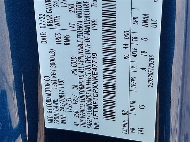 THIS VEHICLE INCLUDES THE FOLLOWING FEATURES AND OPTIONS: Equipment Group 101A High (Cruise Control and Reverse Sensing System), XL Chrome Appearance Package (Chrome Front & Rear Bumpers and Wheels: 17 Silver Painted Aluminum), XL Power Equipment Group (Illuminated Entry, MyKey, Perimeter Alarm, Power Door Locks, Power Front Windows, Power Glass Sideview Mirrors w/Black Skull Caps, and Power Tailgate Lock), 3.55 Axle Ratio, 4 Speakers, 4-Wheel Disc Brakes, ABS brakes, Air Conditioning, AM/FM radio, AM/FM Stereo w/4 Speakers, Auto High Beam, Auto High-beam Headlights, Black Platform Running Boards, Brake assist, Cloth 40/20/40 Front Seat, Compass, Delay-off headlights, Driver door bin, Dual front impact airbags, Dual front side impact airbags, Electronic Stability Control, Emergency communication system: SYNC 4 911 Assist, Exterior Parking Camera Rear, Fog Lamps, Front anti-roll bar, Front Center Armrest, Front reading lights, Front wheel independent suspension, Fully automatic headlights, Lane-Keeping System, Low tire pressure warning, Occupant sensing airbag, Outside temperature display, Overhead airbag, Overhead console, Passenger door bin, Passenger vanity mirror, Power steering, Pre-Collision Assist w/Automatic Emergency Braking, Radio data system, Rear step bumper, Rear-View Camera, Speed-sensing steering, Steering wheel mounted audio controls, SYNC 4, Tachometer, Telescoping steering wheel, Tilt steering wheel, Traction control, Trip computer, Variably intermittent wipers, Voltmeter, and Wheels: 17 Silver Steel.