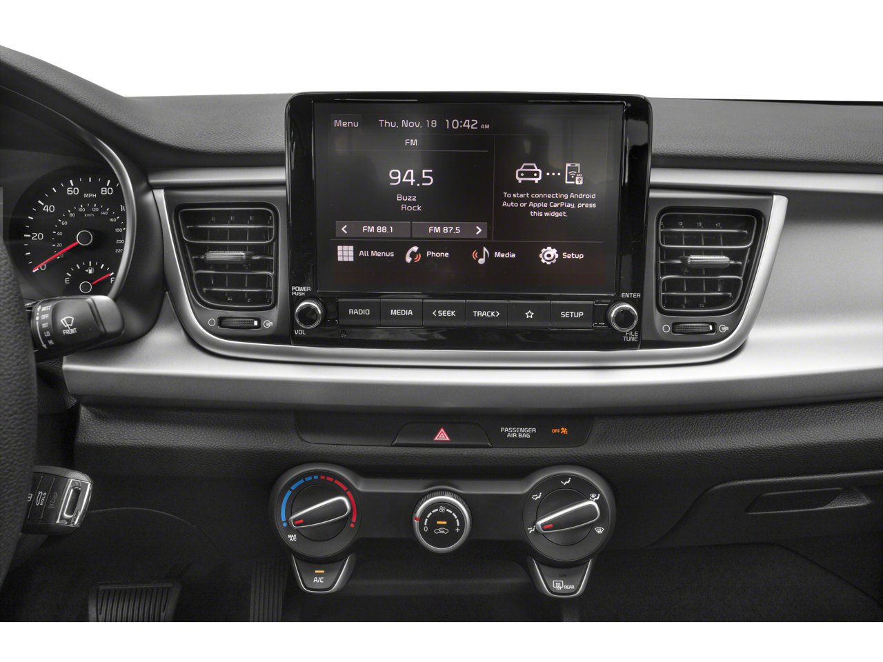 This Vehicle Includes the Following Options: Technology Package (15 x 5.5J Alloy Wheels, Automatic Temperature Control, Chrome Door Handles, Forward Collision Avoidance Assist, Highline Tire Pressure Monitoring System (TPMS), Kia Connect eServices, LED Headlights, LED Positioning Lights, Push Button Start w/Immobilizer, Rear Disc Brakes, Rear Occupant Alert, SiriusXM Satellite Radio, and Supervision Meter Cluster), Black Cloth, 6 Speakers, ABS brakes, Air Conditioning, AM/FM radio, Brake assist, Bumpers: body-color, Driver door bin, Driver vanity mirror, Dual front impact airbags, Dual front side impact airbags, Electronic Stability Control, Front anti-roll bar, Front Bucket Seats, Front Center Armrest, Front reading lights, Front wheel independent suspension, Fully automatic headlights, Heated door mirrors, Illuminated entry, Low tire pressure warning, Occupant sensing airbag, Outside temperature display, Overhead airbag, Overhead console, Panic alarm, Passenger door bin, Passenger vanity mirror, Power door mirrors, Power steering, Power windows, Radio: AM/FM/MP3 Audio System, Rear window defroster, Remote keyless entry, Speed control, Speed-sensing steering, Split folding rear seat, Steering wheel mounted audio controls, Tachometer, Tilt steering wheel, Traction control, Trip computer, Variably intermittent wipers, Wheels: 15 x 5.5J Steel w/Full Covers, and Woven & Tricot Cloth Seat Trim.