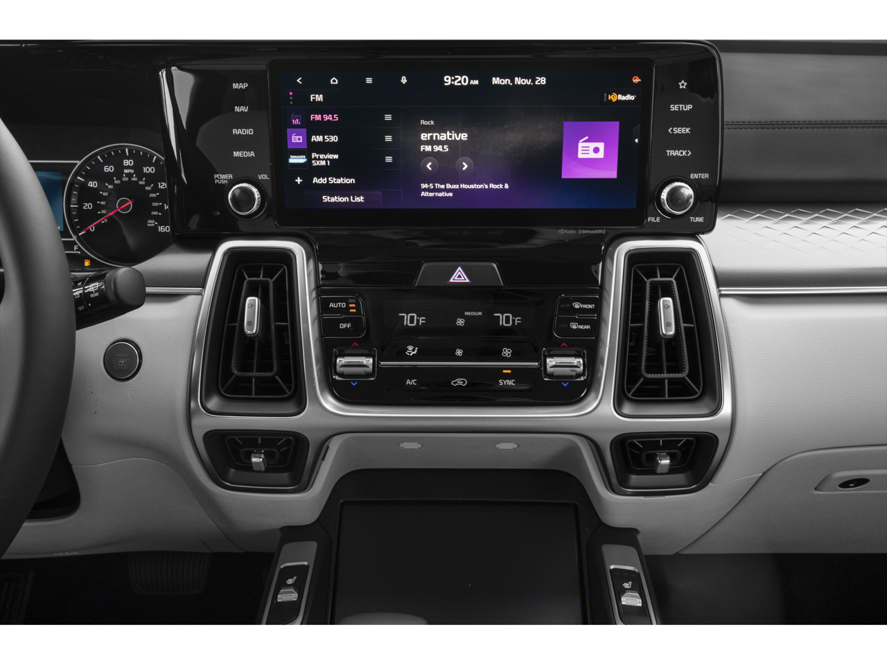 - AM/FM radio: SiriusXM, Radio: AM/FM Audio System, Automatic temperature control, Power driver seat, Remote keyless entry, Smart Key w/ Push Button and Remote Start, Steering wheel mounted audio controls, Brake assist, Electronic Stability Control, Speed-sensing steering, Heated door mirrors, Roof rack: rails only, Turn signal indicator mirrors, Apple CarPlay & Android Auto, Illuminated entry, LED Interior Lighting, Telescoping steering wheel, Tilt steering wheel, Navigation System, Exterior Parking Camera Rear, Heated Front Bucket Seats, Panic alarm, Security system, Panoramic Power Sunroof w/Power Sunshade, Alloy wheels
