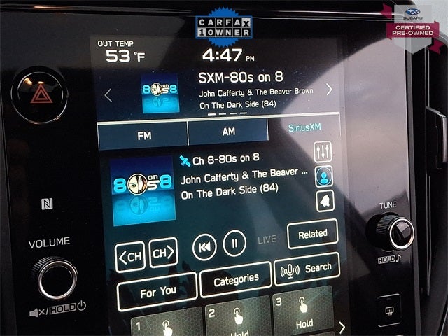 - Radio: Subaru 11.6" Multimedia Plus System -inc: AM/FM stereo, HD Radio, multi-touch gesture high resolution display screen, voice activated controls, Bluetooth® audio streaming and hands-free phone connectivity, Bluetooth® hands-free SMS text messaging connectivity, iPod control capability, SiriusXM w/360L (4 months free trial included/subscription required after), SiriusXM Travel Link (4 months free trial included/subscription required after), smartphone integration: Android Auto and Apple CarPlay w/full screen view and wireless connection, USB and Over The Air (OTA) audio system update, steering wheel audio system and Bluetooth® control switches, 6 speakers (2 dash panel tweeter, 2 front door and 2 rear door), illuminated 3.5mm auxiliary input jack, illuminated front USB A and C input/charge ports and illuminated rear USB A and C charge ports